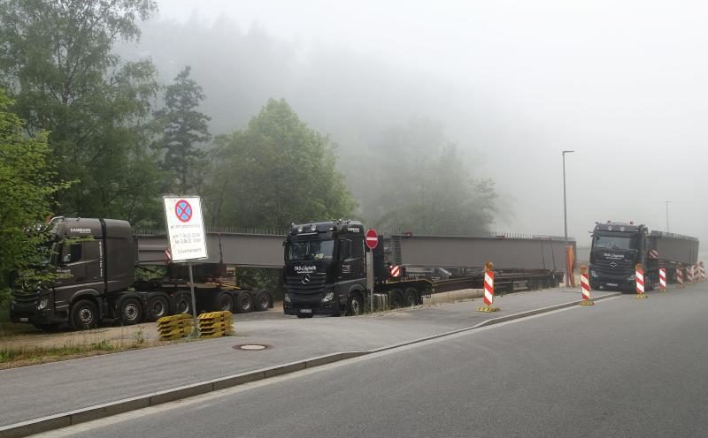 Ihre Anlieferung in der Nacht von Donnerstag auf Freitag verlief reibungslos. Auch die Engstellen durch Velden machten den Fahrern kaum Probleme. Der Schwertransport hatte sich am Donnerstagabend gegen 22 Uhr in Bewegung gesetzt. Über die A9 Ausfahrt Pegnitz ging es über Auerbach und Neuhaus zum Parkplatz in Velden kurz vor der Einbaustelle Güntersthal, wo alle vier zwölfachsigen Tieflader bereits gegen vier Uhr morgens angekommen waren, wie ein gut gelaunter Fahrer aus seiner Fahrerkabine berichtete.
