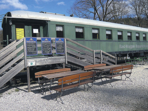 Der Regionalzug nach Neuhaus hält nach dem Tunnel „Platte“ am verwaisten Bahnhof Rupprechtstegen. Bitte in Fahrtrichtung rechts aussteigen! Nur eine Handvoll Wanderer verlässt am Palmsonntag den Zug. Der Bahnsteig gut abgesichert gegen Erdrutsch. Es ist bitterkalt. Ich überschreite die Gleise (beschrankter Bahnübergang) und steuere einen abgestellten Waggon der ehemaligen Deutschen Reichsbahn an. Ursprünglich ein Wagen 3. Klasse, später umgebaut auf 2. Klasse. Bis in die 70er Jahre im Einsatz. Seit geraumer Zeit als „Rast-Waggon“ in Betrieb.