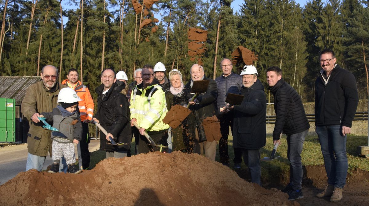Bürgermeister Michael Schmidt, Ingenieur Michael Miller, Markus Stiegler von der Baufirma Mickan und Bauamtsleiter Alfred Markgraf haben zusammen mit einigen Gemeinderäten sowie Klärwärter Mike Kasbeitzer den ersten Spatenstich getan. Ein tüchtiger kleiner Bauarbeiter mit grünem Schäufelchen unterstützte sie dabei. Finn, Enkel von Gemeinderat Erwin Reitzmann, stach mit seinem Minispaten ebenso wie die Großen in den obligatorischen Sandhaufen.