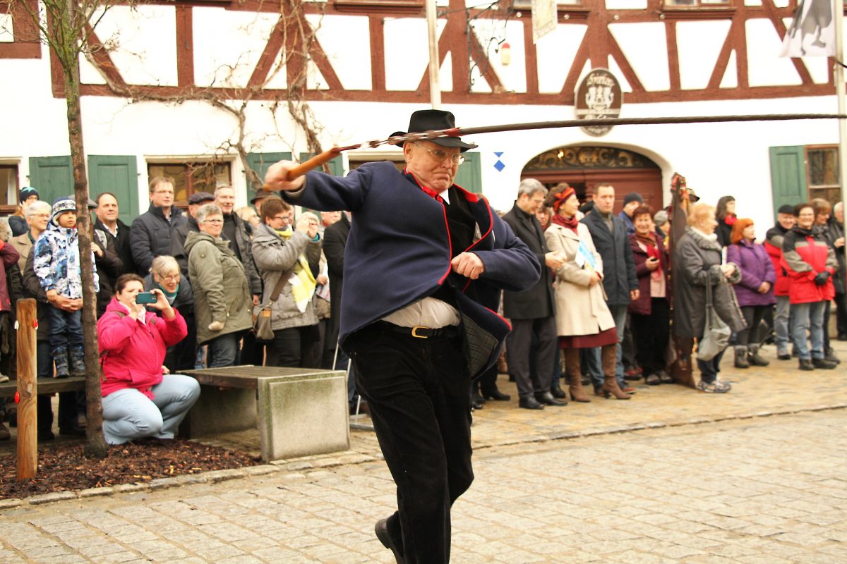 Um 11 Uhr eröffnet Bürgermeister Robert Ilg das Fest, musikalisch unterstützt von der Stadtkapelle Hersbruck und von Robert Vogel, der den Hersbrucker Hirtenruf auf seinem originellen „Vogelhorn“ spielt. Und dann knallt es: Hermann Schmitt, der Sohn des letzten Stadthirten, und Thomas Geiger, sein „Geselle“, schwingen die Ringelpeitsche (noch einmal um 14 Uhr).