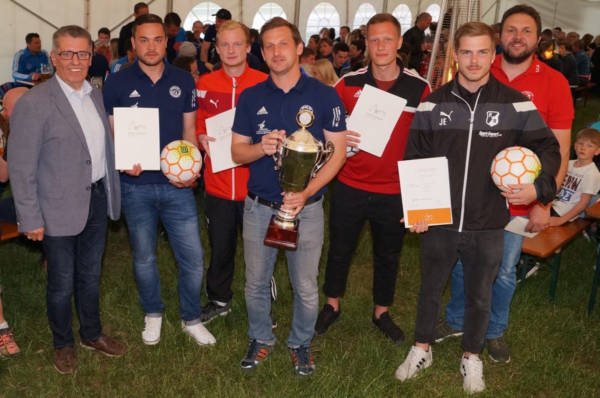 Bürgermeister Erich Odörfer mit den Teamvertretern Felix Ortegel (SV Rasch), Matthias Hupfer (SCE), Matthias Merkel (SVR), Thomas Lechner (FCA), Jonas Ernesti (FV Röthenbach) und Clemens Geyer, 1. Vorsitzender des SCE (v.l.). | Foto: Keilholz2018/05/stadtpokal2018_1.jpg
