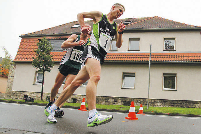 In persönlicher Bestzeit holte sich der Röthenbacher Geher Andreas Janker den Deutschen Vizemeistertitel über 50 km. Das Bild zeigt ihn mit Steffen Borsch vom SV Halle (im Hintergrund) an der Wendemarkierung. Foto: Pohle