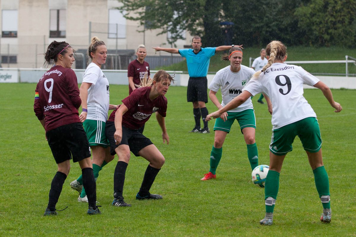 Die Ezelsdorferinnen begannen beim ersten Auswärtsmatch in Regensburg mutig. Die erste Möglichkeit für den FCE produzierten die Gastgeberinnen selber: Eine Verteidigerin traf bei einem Klärungsversuch das Leder so unglücklich, dass es sich bedrohlich in Richtung eigenes Tor senkte und Torfrau Katja Hubeny nur mit Mühe abwehren konnte. Dadurch beflügelt spielten die Gäste weiter gekonnt nach vorne und hatten gute Abschlussmöglichkeiten. Maike Wintrich setzte sich nach einer starken Einzelaktion durch, die Torfrau konnte nur per Fußabwehr klären. Die hochkarätigste Chance hatten dann wieder die Gäste, Melanie Schneider setzte Laura Loos in Szene, die das Leder an ihrer Bewacherin vorbei legte, aber dann freistehend vor dem Kasten vorbeizielte. In den letzten zehn Minuten vor der Pause kamen die Gastgeberinnen besser ins Spiel, Lisa Beer setzte zum Glück für den FCE den Ball nur an den Innenpfosten.