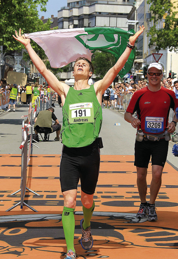 FÜRTH/RÖTHENBACH – Einen Triumph feierte der Röthenbacher Langstreckenläufer Andreas Janker beim Metropolmarathon in Fürth (im Bild beim Zieleinlauf). Die Läufe verlangten den Athleten wegen der Hitze einiges ab, dafür wurden sie durch die gute Stimmung an der Strecke gut unterstützt. Auf allen Strecken gab es überlegene Sieger. Beim Marathon setzte sich Andreas Janker vom DAV Röthenbach in 2:42:05 Stunden gegen Vorjahressieger Markus Spägele durch. Frauensiegerin wurde Sigrid Hoffmann aus Erlangen in 3:05:26 Stunden. Den Halbmarathon gewann Matthias Flade, TV Münchberg, in 1:15:10 Stunden, die schnellste Frau war hier Susanne Heinrich, SV Elbland Coswig-Meißen in 1:30:20 Stunden. Auf der 10km-Strecke setzte sich der Deutsche Meister in der Altersklasse M50, Hans Joachim Herrmann (LG Erlangen), in 34:26 Minuten durch. Schnellste Läuferin war hier die 17-jährige Stefanie Gebhardt in 42:41 Minuten.Foto: T. Kiefner