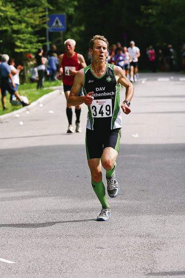 RÖTHENBACH — Andreas Janker (im Bild) vom DAV Röthenbach hat im Lauf-Cup des bayerischen Leichtathletikverbandes mit starken Leistungen seine Spitzenposition weiter ausgebaut. Beim Indersdorfer Straßenlauf nördlich von Münche, nahm der Röthenbacher aus dem laufenden Marathontraining heraus ohne besondere Vorbereitung teil. Trotz schwülwarmer Witterung von 26 Grad gelang Janker über die 10 km mit 33:51 Minuten eine starke Zeit und musste sich hier in der Gesamtwertung nur dem in München lebenden und für den PTSV Rosenheim startenden Kenianer Joram Lesoipa geschlagen geben, während ihm in seiner Altersklasse, der Hauptklasse der Männer, der Sieg gelang. Eine Woche später, nach einem kräftezehrenden Trainingslager in Österreich mit über 200 Trainingskilometern, nahm Janker am traditionell stark besetzten Dachauer Straßenlauf teil. Auch in Dachau machte das drückend warme Wetter vielen Läufern zu schaffen. Obwohl auch Janker sich vor dem Start müde fühlte, kam er von Beginn an gut ins Rennen und hielt im Feld – gespickt mit bayerischen Topathleten – hervorragend mit. Am Ende stand für den Röthenbacher auf der wie in Markt Indersdorf amtlich vermessenen 10 km langen Strecke eine für ihn selbst überraschend starke Zeit von 32:49 Minuten zu Buche. Damit konnte er seine bisherige Bestleistung um ganze 39 Sekunden steigern, womit der 28-Jährige an diesem Tag unter diesen Umständen keinesfalls gerechnet hatte. Damit sicherte sich Janker hinter dem bayerischen Spitzenläufer Tobias Gröbl (LG Zusam) und dem Stuttgarter Christian Stanger den 3. Platz in der Gesamtwertung sowie in der Altersklasse. Im BLV-Cup hat der Röthenbacher seine Führung damit weiter ausgebaut. Mit nun 103 Punkten führt Janker nach neun von zwölf Rennen souverän vor Sebastian Zwosta (TSV Neuhaus/Aisch, 57 Punkte) und Timo Gieck (TV Coburg, 56 Punkte) und ist nur noch rechnerisch von der Spitzenposition zu verdrängen. Bereits beim nächsten Rennen in Herzogenaurach kann Janker den Gesamtsieg und damit die Wiederholung seines Vorjahreserfolges vorzeitig perfekt machen.