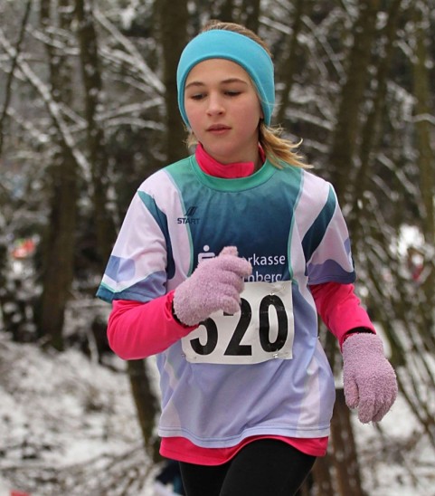 Auch dass der Wintereinbruch die Strecke in eine Matschpiste verwandelt hatte, hat Antonia Sörgel (Bild) nicht stoppen können. Leichtfüßig eilte die Kainsbacherin im Trikot des LAV Hersbruck zur Mittelfränkischen Meisterschaft im Crosslauf der Altersklasse W12. Antonia begann die etwa zwei Kilometer lange Distanz beim Sportgelände des ASV Forth relativ verhalten. Auf dem kräftezehrenden Untergrund arbeitete sie sich dann nach vorne. Im Ziel nach 8.43 Minuten lag das LAV-Mädchen zehn Sekunden vor der Zweiten und 30 Sekunden vor der Dritten. Im Feld der 14 Starterinnen zeigte der Nachwuchs des LAV Hersbruck auch eine gute Teamleistung: Verena Sörgel und Theresa Hartmann landeten auf den Rängen fünf und neun. In der W13 überquerte Annkatrin Krug als Sechste die Ziellinie. Fast hätte es für Antonia Sörgel einen Doppelerfolg gegeben. Zusammen mit Annkatrin und Verena holte sie in der Teamwertung hinter dem LAC Quelle Fürth die Silbermedaille. Frederic Willinsky (LAV) schrammte nur knapp am Titel der M13 vorbei. Er musste sich am Ende nur einem Dinkelsbühler geschlagen geben und wurde ebenfalls Zweiter. Theresa Sörgel und Kristin Krug vertraten im Rahmenwettbewerb der W10 die Farben des LAV Hersbruck ausgezeichnet. Nach 1200 Metern kam das schnelle Duo unter 20 Teilnehmerinnen auf die Ränge zwei und drei. Foto: J. Ruppert