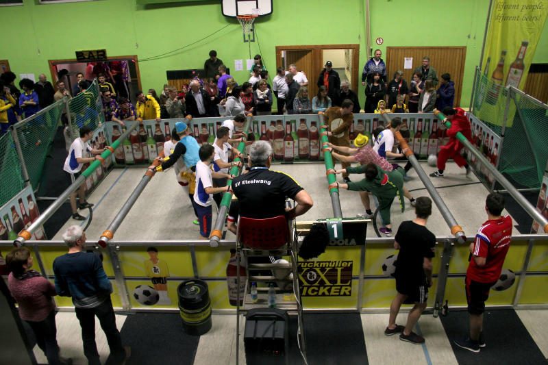 Insgesamt 13 Mannschaften hatten sich innerhalb kürzester Zeit für den ersten „SVE-Bruckmüller XXL Kicker Cup“ angemeldet. Und schon die Teamnamen ließen erahnen, dass hier eindeutig der Spaß regiert – standen sich doch Mannschaften wie „Stark am Glas“, „Schafsköpfe“ oder die „Ballerfrauen“ im Kickerfeld an den Stangen gegenüber.