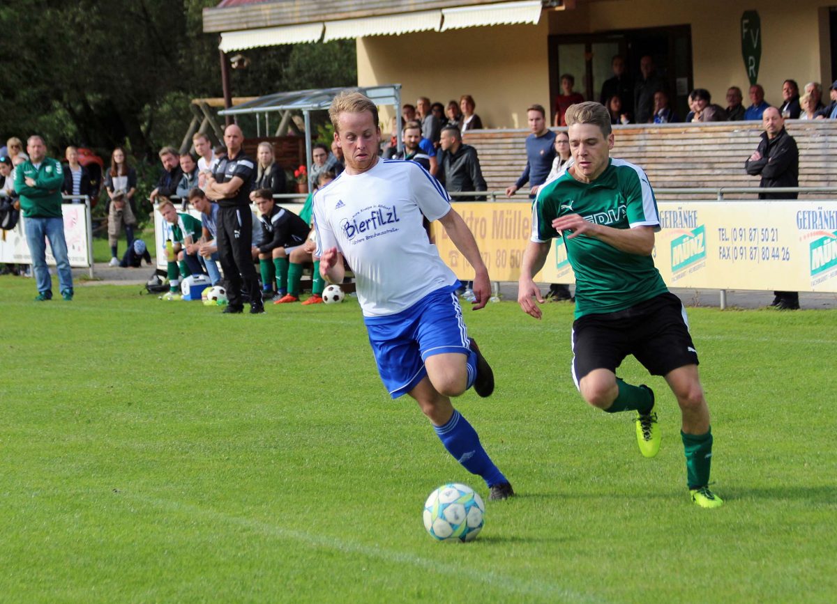 FV Röthenbach – SV Rasch II 2:1 (2:0) – Das Derby begann mit klaren Vorteilen für die Heimelf. In der 14. Minute konnte ein langer Ball von der Rascher Defensive nicht geklärt werden, so dass René Ampleews den Gästekeeper umkurvte und zum 1:0 einschob. Der FVR blieb weiter aktiv, der nächste Abschluss von Philipp Mangold konnte gerade noch zur Ecke abgewehrt werden. Das 2:0 fiel dann in der 24. Minute nach einem schönen Spielzug: Philipp Mangold führte einen schönen Seitenwechsel auf Daniel Späth aus, welcher quer auf Christoph Stahl legte, der mit einem platzierten Schuss ins lange Eck vollendete. Die Gäste wurden lediglich kurz vor der Halbzeit einmal gefährlich, als nach einer Ecke im Gewühl der Ball den Weg an die Latte fand. Die zweite Hälfte begann zunächst sehr zerfahren, beide Mannschaften beackerten sich größtenteils im Mittelfeld, ohne gefährlich in Strafraumnähe zu gelangen. Die erste gute Gelegenheit gehörte dann den Gästen, FVR-Keeper Jonas Ernesti blieb aber im Eins gegen Eins der Sieger gegen den Rascher Stürmer. Auf der Gegenseite beförderte Daniel Späth den Ball nach einer Freistoßflanke per Flugkopfball nur knapp am Kasten vorbei. Die Gäste machten nun das Spiel, der FVR verlegte sich aufs Kontern. Doch weder die Gäste konnten gegen die sichere FVR-Defensive wirkliche Torchancen kreieren, noch konnte der FVR seine Konter konzentriert zu Ende spielen. So dauerte es bis zur 86. Minute, ehe Michael Meier per Kopf den Anschlusstreffer für die Rascher Reserve erzielen konnte. Die Gäste warfen nochmals alles nach vorne, die Röthenbacher ließen aber keine weiteren Gelegenheiten mehr zu und fuhren den Derbysieg nach Hause. Die Rascher liegen trotz der ersten Niederlage weiterhin punktgleich mit Neumarkt Süd an der Tabellenspitze.