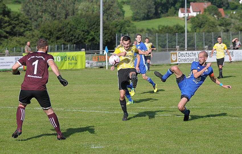 SIMMELSDORF. Fußballfans sind es nach den EM-Wochen ja gewohnt, dass wichtige Spiele erst im Elfmeterschießen entschieden wurden. Hier reiht sich nun auch das Finale um den Kreis-Totopokal ein. Nachdem es nach der regulären Spielzeit zwischen der SpVgg Hüttenbach-Simmelsdorf und den Gästen vom SC Adelsdorf 1:1 stand, musste der Sieger vom Punkt gekürt werden. Das glücklichere Ende hatte schließlich Adelsdorf für sich, nachdem alle SC-Schützen verwandelten, während bei der SpVgg Hüttenbach ausgerechnet der sonst sichere Elfmeterschütze Andreas Gruner übers Tor schoss.