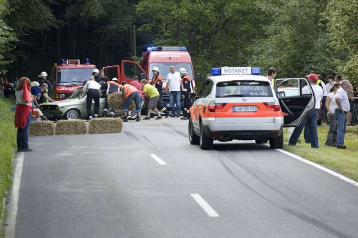 Die erste Meldung ließ Schlimmes ahnen: „Fahrzeug beim Happurger Berg in Personengruppe“ lautete die Einsatzmeldung der Rettungsleitstelle Nürnberg. Beim Anbremsen vor einer Schikane hatte ein 53-jähriger Teilnehmer die Kontrolle über seinen 32 Jahre alten Polo verloren, sein Wagen war nach links ausgebrochen, auf den Grünstreifen geraten und rückwärts in eine Zuschauergruppe geschleudert. Anschließend prallte der Wagen gegen ein abgestelltes Motorrad. Drei Personen wurden bei dem Unfall ins Gebüsch geschleudert. Glücklicherweise stellten sich deren Verletzungen aber als weit glimpflicher heraus, als zunächst befürchtet. „Fleischwunden und Prellungen“, diagnostizierte der schnell eingetroffene Notarzt, das BRK brachte die Verletzten zur weiteren Behandlung ins Krankenhaus. Weil die Versorgung länger dauerte und so die für den Wettbewerb zur Verfügung stehende Zeit knapp wurde, entschied sich die Rennleitung vom veranstaltenden AC Hersbruck, auf den zweiten Lauf zu verzichten und heuer keine Wertung vorzunehmen. kpFoto: A. Schulz-Rogge