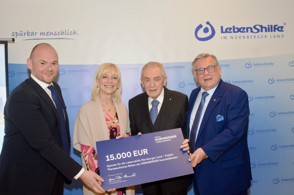 Als Beispiel nannte er den Ausbau des Schönberger Reittherapiezentrums mit Überdachung des Reitplatzes, wofür sein Dank Hans-Peter Schmidt galt, der als Vorsitzender des Stiftungsrats der Nürnberger Versicherung einen Scheck über 15.000 Euro überreichte, „um das therapeutische Reiten noch weiter voranzubringen“. Das Pferd habe für die Lebenshilfe eine wichtige Bedeutung, meinte er und unterstrich den Beispielcharakter des therapeutischen Reitzentrums der Lebenshilfe Nürnberger Land.