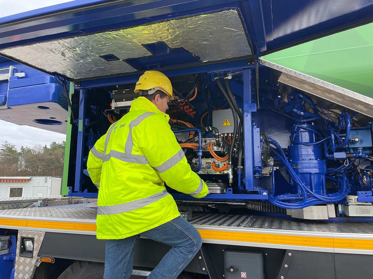 Aber es sind auch die ganz alltäglichen Arbeitsabläufe, die sich mit dem Bau des elektrifizierten Krans ändern. Allem voran steht dabei die Arbeitssicherheit. Schließlich ist im Umgang mit den Hochvolt-Komponenten große Umsicht angesagt. Das betrifft in erster Linie das Handling des Akkus. Er muss sicher gelagert, transportiert und montiert werden. Dabei gilt es die speziellen Sicherheits-Vorschriften zur Hochvolt-Technologie ebenso zu beachten wie die gesetzlichen Rahmenbedingungen. Hierfür hat man im Werk beispielsweise spezielle Lagerplätze für die Batterien ausgewiesen und für die Montage gesonderte Arbeitsbereiche vorgesehen. „Und natürlich haben wir auch unsere Mitarbeiter vor Ort für die Arbeit an Hochvoltsystemen geschult und qualifiziert“, berichtet Andreas Leser von der Arbeitssicherheit.