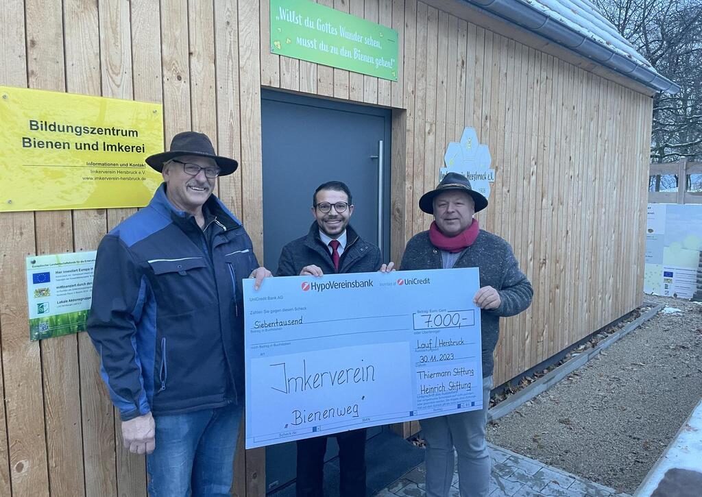 HERSBRUCK – Der Imkerverein Hersbruck wird gleich von mehreren Gönnern bedacht. Denn die beiden Vorsitzenden Thomas Reichel und Peter Denis konnten von der Gerhard und Elfriede Heinrich-Stiftung 1000 Euro und von der Irene Thiermann-Stiftung 6000 Euro, beide vertreten durch Sebastian Brütting von der HypoVereinsbank, für den Bienenweg in Ellenbach in Empfang nehmen.