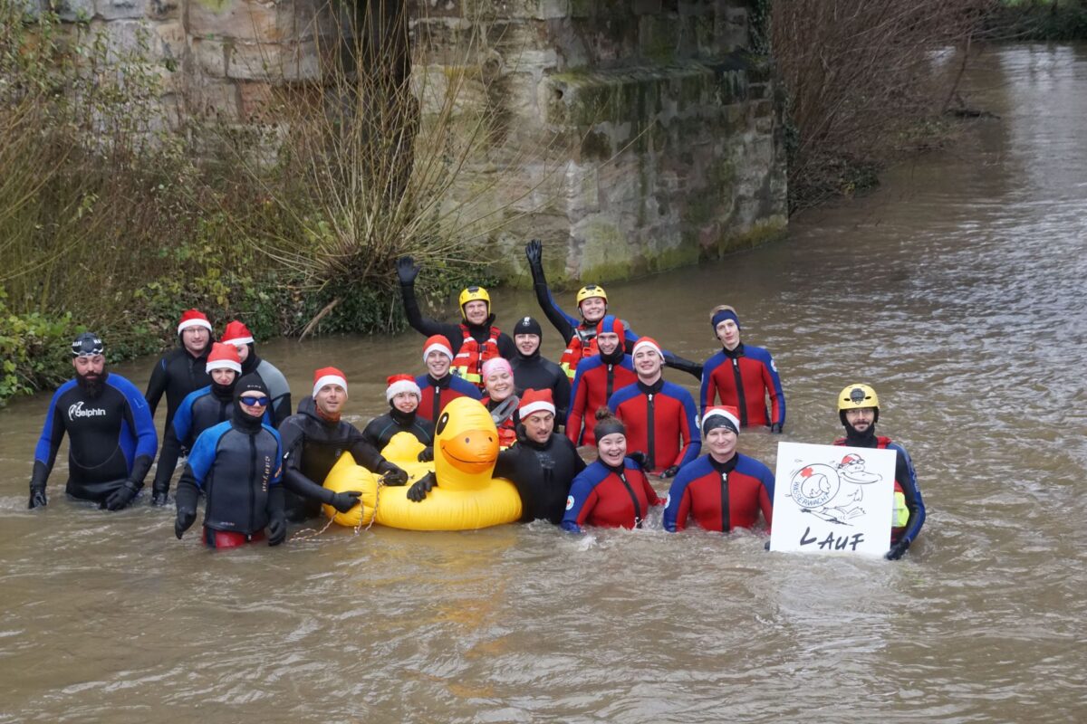 LAUF – 19 Schwimmer der Wasserwachten aus Lauf und Hersbruck haben sich in der Vorweihnachtszeit beim zweiten Adventsschwimmen in die Pegnitz bei Lauf gestürzt. Nach Auffassung der Teilnehmer „nahezu tropische“ acht Grad Celsius Lufttemperatur und fünf Grad Celsius Wassertemperatur hatte es an jenem Tag. Zusätzlich zeigte sich die Sonne hin und wieder.