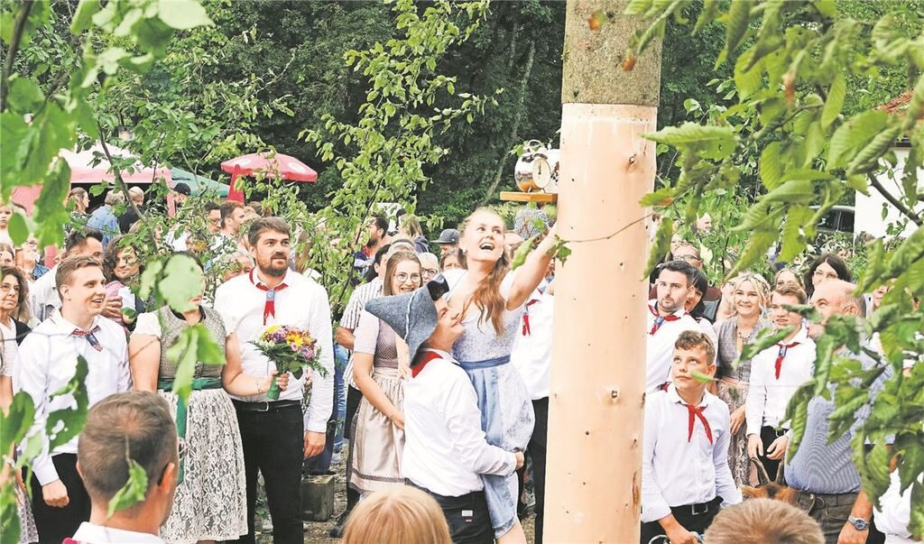 Am Samstagmittag wurde der 29 Meter lange Kirwabaum zunächst mit den Kränzen geschmückt, die die Kirwamadler gebunden hatten, und dann von den Kirwaboum unter Leitung von Stefan Neuner und Stefan Sperber sowie unter den wachsamen Augen der Zuschauer in die Senkrechte gehievt. Nach getaner Arbeit sorgte die Partyband „West“ im Bierzelt für Stimmung.
