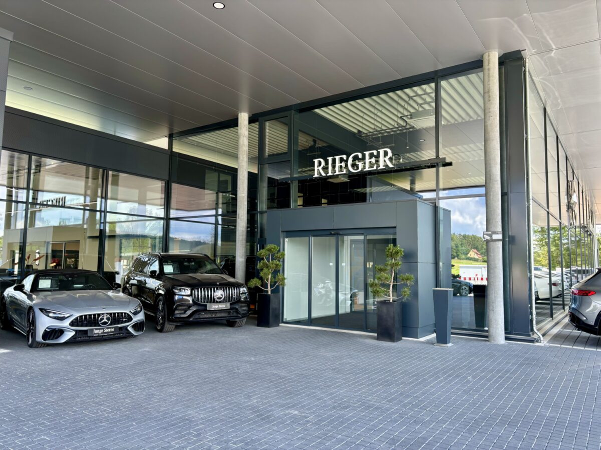 In Kammerstein finden Kunden auf einer Gesamtfläche von 1,5 Hektar und einer bebauten Fläche von 3.230 Quadratmetern weit mehr als „nur“ eine Auto-Ausstellung: Es ist eines der modernsten Autohäuser der Region und als eine lebendige Begegnungsstätte konzipiert. Ein umweltfreundliches und energetisch durchdachtes Gesamtkonzept bildet die Basis, dazu schaffen ansprechende Architektur und Design eine Atmosphäre zum Wohlfühlen. Alles ist auf den Dialog mit den Kunden ausgerichtet, denn das Rieger Team will die Faszination Mercedes-Benz zu einem Gesamterlebnis machen. Neueste Medientechnik schafft diese besondere Erlebniswelt und vernetzt perfekt die Dienstleistungen in allen Bereichen.