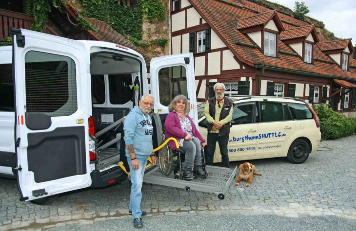 Ursprünglich hatten Angelika und Thomas Feisthammel aus Oberferrieden diese Dienstleistung dafür gedacht, junge Leute nach Partys und anderen Feiern unfallfrei und sicher nach Hause zu bringen. Inzwischen ist dieser Service zu einem innovativen Unternehmen mit mehreren Fahrzeugen angewachsen. Das Besondere daran: burgthannSHUTTLE ist als „Rollstuhl-Taxi“ speziell auf Menschen mit Körperbehinderung eingerichtet. Dafür stehen Kleinbusse zur Verfügung, die von der Rampe bis zur Sicherung der Rollstühle alles für komfortable Fahrten bietet. Da sie selbst auf einen Rollstuhl angewiesen ist, weiß Angelika Feisthammel worauf es dabei ankommt. Eine neue Größe im Fuhrpark: Der Ford Transit mit Hebebühne. Bis zu vier Rollstuhlfahrer (mit Elektro-Rollis) können hier gemeinsam auf Tour gehen, sei es zum Einkaufen, in den Biergarten oder zu einem Konzert. Selbstverständlich gehören zum Shuttle Service auch Kranken-, Kur- und Dialysefahrten – abrechnen kann burgthannSHUTTLE mit vielen Krankenkassen, private Fahrten auch über nahezu alle Bezirke.