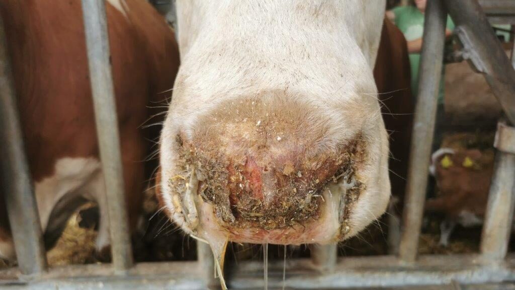 So sieht das Maul eines unter den Symptomen der Blauzungenkrankheit leidenden Rinds aus. | Foto: Andreas Sichelstiel2024/09/blauzungenkrankheit__1.jpg