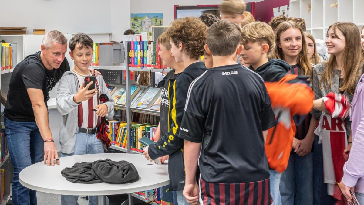 Danach stand er ausdauernd allen übrigen Fans für Autogramm- und Selfiewünsche zur Verfügung (es soll eine Lehrkraft sogar extra aus ihrer Elternzeit vorbeigekommen sein). Die Schlange der Schülerinnen und Schüler wollte lange nicht kleiner werden, doch der ehemalige Clubspieler erfüllte über eine Stunde lang jeden Wunsch, sodass es für alle zu einem einmaligen Erlebnis wurde – und natürlich standen nicht nur Clubfans an, um ein Autogramm oder ein Bild mit ihm zu bekommen.