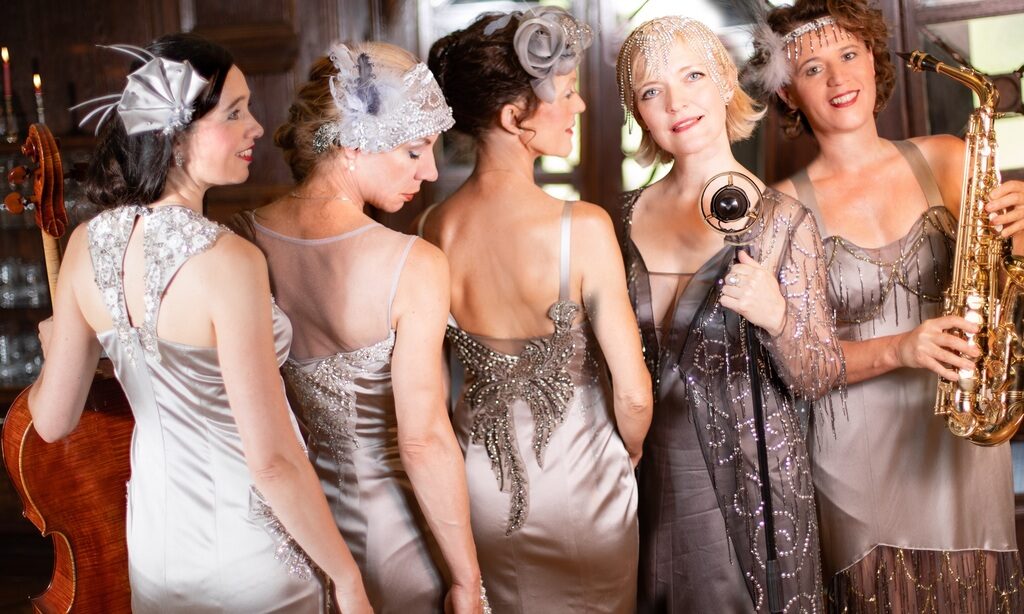 Musikalisch begleitet das Quintett die Diven der Filmgeschichte des vergangenen Jahrhunderts. Die „Salondamen“ singen dabei nicht nur, sie beherrschen auch Violoncello, Violine, Klarinette, Akkordeon, Saxofon, Cello, Klavier und Kontrabass.