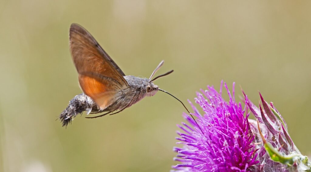 Das Taubenschwänzchen ist ein am Tag fliegender Nachtfalter. Bei der Nektarsuche ist der auffällige Schmetterling nicht wählerisch. Gartenbesitzende können ihn deshalb oft auch an exotischen Pflanzen beobachten. „Beim Nektartrinken schwirrt der Falter ähnlich wie Kolibris vor der Blüte in der Luft und wird somit häufig mit den kleinen Vögeln verwechselt, die aber gar nicht in Deutschland vorkommen“, erklärt Treffehn.