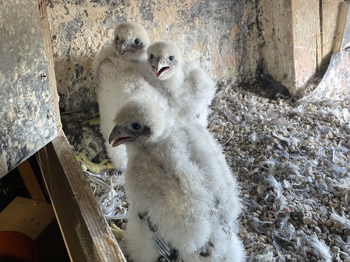 Ihr weißes Daunenkleid haben die einstigen Küken inzwischen fast abgelegt und sind innerhalb weniger Wochen zu Jungfalken mit einem dunklen Federkleid herangewachsen. Rund 35 Tage nach dem Schlupf aus dem Ei werden sie dann auch schon flügge und unternehmen erste Flugübungen. Dabei landen sie mitunter auf umliegenden Dächern oder gar auf Bodenniveau. Bis sie ihren Babyspeck verloren und die Flugmuskulatur soweit aufgebaut haben, dass sie aus eigenen Kräften wieder zur schützenden Brutnische auf dem Kirchturm fliegen können, kann es eine Woche dauern.