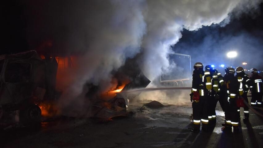 Wie die Feuerwehr auf Nachfrage bestätigt, hatte am Montagabend um kurz nach 22 Uhr ein 34-jähriger Lkw-Fahrer einen lauten Knall gehört, woraufhin sein Lkw, ein Gliederzug mit Anhänger, langsamer wurde. Laut seiner Anzeige im Fahrzeug sei der Motor überhitzt gewesen. Der Fahrer blieb stehen und nur wenige Sekunden später schlugen die Flammen aus dem Fahrzeug – der Lkw stand bald in Vollbrand.