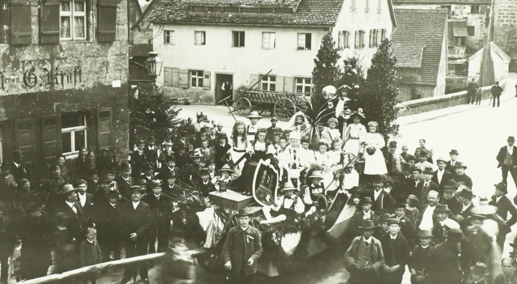 Es zeigt den ersten Wagen des Kunigundenfestumzugs aus dem Jahr 1894. Auf ihm thronte die damalige Protagonistin des Festes, die „Laufia“ mit dem Stadtwappen als Personifikation der Stadt Lauf, begleitet von weiß gekleideten Mädchen und Knaben. Weitere Symbole verkörpern Handel und Gewerbe. Die Kunigunde, die in Person eines Mädchens den Zug reitend begleitet, gibt es erst ab dem Jahr 1932, erklärt Ina Schönwald.