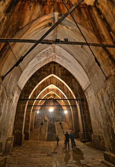 In der Spitzbogenhalle mit den zweifach verkeilten beziehungsweise diagonalen schmiedeeisernen Zugankern fühlt man sich fast wie in einer gotischen Kathedrale. Der Innenraum ist 26 Meter lang, am Eingang 9,40 Meter breit, die Gewölbehöhe beträgt an der höchsten Stelle 10,60 Meter, und die Mauerstärke beträgt 2,40 bis 3,80 Meter.