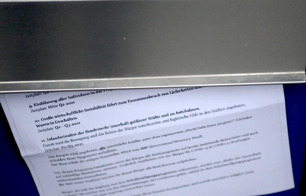Von einer angeblichen „Errichtung von Isolationszentren in allen Ländern und Kommunen“, über die „Reformierung des Arbeitslosengeldes zum Programm für individuelles Grundeinkommen“ bis hin zu „Inlandseinsätzen der Bundeswehr innerhalb größerer Städte und an Autobahnen, um Reisen der Bürger zu verhindern“: An absurden Gedankenspielen, die im Zusammenhang der Corona-Pandemie und einer weltweiten Verschwörung stehen sollen, wird in den Zeilen nicht gespart.