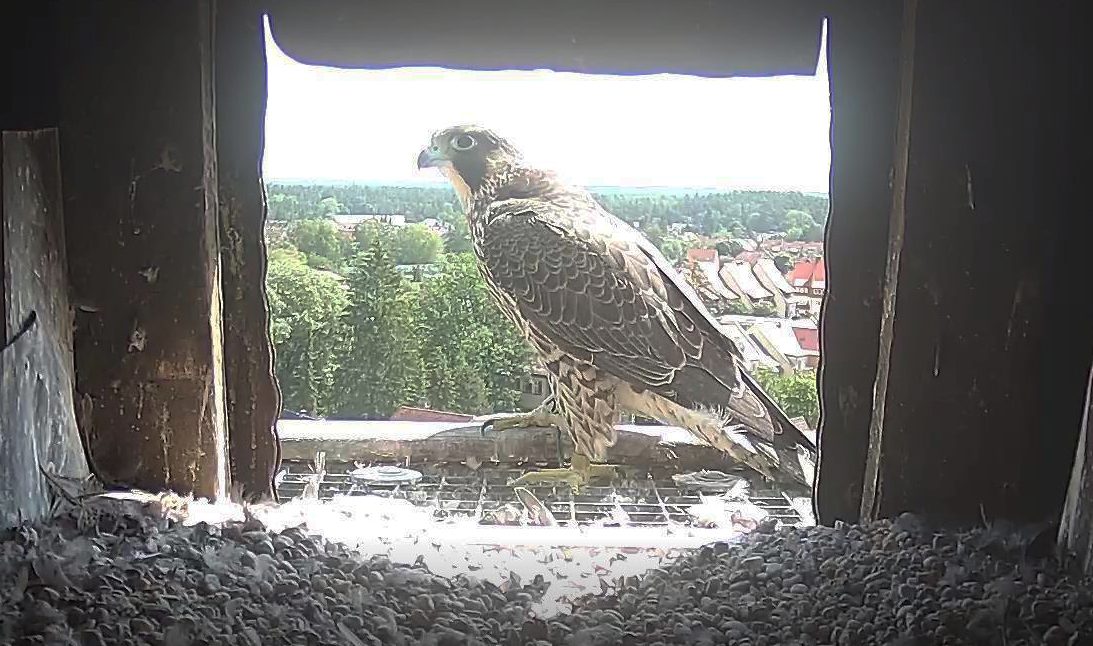 FEUCHT – An Ostern ist es geschlüpft, nun wird es flügge. Ganz Feucht beobachtet über die Webcam der Marktgemeinde, wie das junge Falkenmädchen von seinen Eltern im Nest im Turm der katholischen Kirche aufgezogen wird.