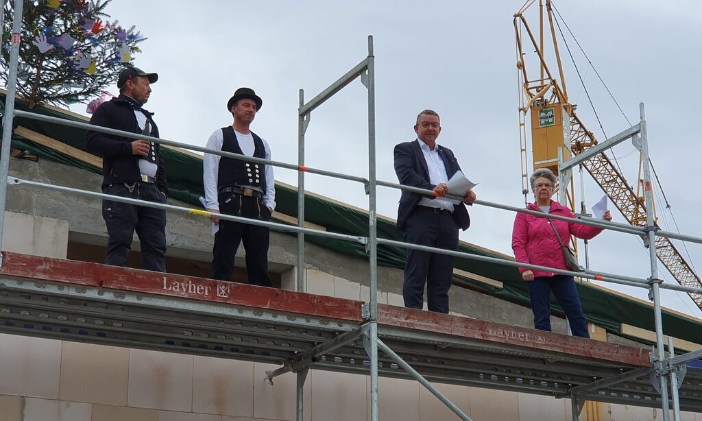 Pfarrerin Christiane Schlenk war zusammen mit den Zimmerleuten und dem Bürgermeister nach oben gestiegen und sprach aus luftiger Höhe einen Segensspruch für alle jetzt und zukünftig dort Arbeitenden, für alle, die Entscheidungen für das Projekt zu treffen haben und für die Kinder. Sie dankte allen herzlich, die nie aufgehört haben, dieses Projekt zu fordern. „Was lange währt, wird endlich gut und was man hier schon sieht, nicht nur gut, sondern sehr gut“, sagte Pfarrerin Schlenk. Im Anschluss konnten die Gäste bei Getränken und einem Imbiss im zukünftigen Gemeindesaal miteinander ins Gespräch kommen.