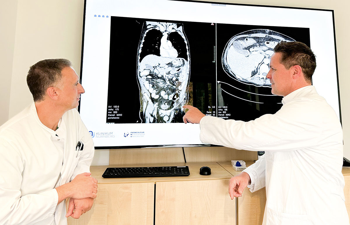 Dr. Konstantinos Moutzouris (l.) und Prof. Dr. Markus Diener begutachten die CT-Aufnahme eines Patienten, um die ideale Therapie zu planen. | Foto: Krankenhaus Lauf2025/10/KNL_01.jpg