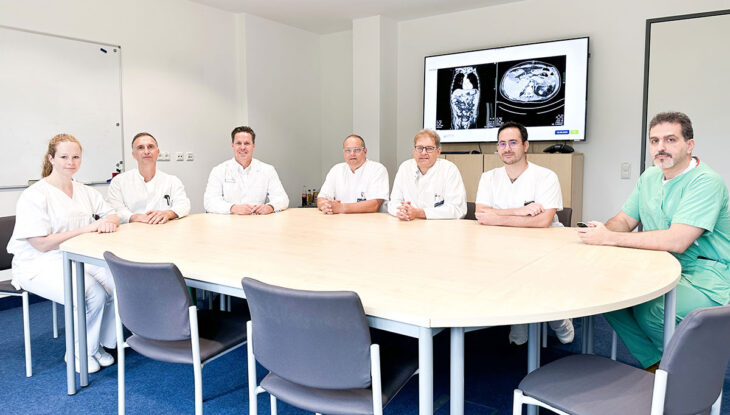 Hernieneingriffe zählen übrigens zu den häufigsten chi­rurgischen Operationen – in Deutschland sind es Studien zufolge bis zu 350.000 Fälle pro Jahr. Die Erkrankung ist für die Patienten nicht nur schmerzvoll, sondern auch mit Schamgefühl und Einschränkungen im täglichen Leben verbunden. „Um hier zu helfen und dem hohen Bedarf gerecht zu werden, ist eine hoch qualifizierte Hernien-Chi­rurgie in Wohnortnähe unabdingbar. Ich bin sehr froh, dass wir mit den zwei Standorten unseres Zentrums in Lauf und Nürnberg wirklich viele Patienten in der Metropolregion behandeln können“, sagt Prof. Diener, nachdem alle aus dem Team, die Dienst haben, nach den Operationen zur Abschluss-Besprechung wieder zusammenkommen. Das gehört zur täglichen Routine und ist ein Standard, um die chirurgische Qualität rund um die Uhr zu gewährleisten. Dr. Moutzouris: „Wir gehen noch einmal alles durch, was am Tag geschehen ist – sprechen aber auch über Dinge, die uns persönlich beschäftigt haben. Chirurgie ist nun einmal vor allem eines: Teamarbeit.“