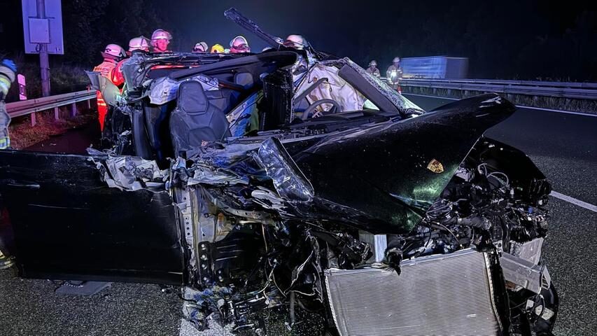 Wie die Polizei schildert, schleuderte das Auto über die Fahrbahn und kollidierte im weiteren Verlauf mit hoher Geschwindigkeit mit einem Sattelzug auf der rechten Spur.
