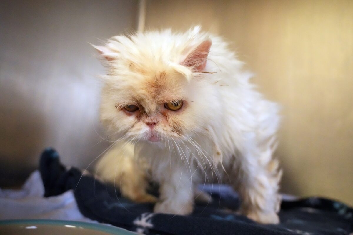 „Das Fell ist dermaßen verfilzt, weshalb er sicherlich geschoren werden muss“, heißt es in einer Pressemitteilung des Tierheims. Aufgrund des schlechten Zustands hänge auch Kot im Fell, was das Tier zusätzlich behindere. „Ein Auge ist eingetrübt und wer weiß was noch alles zu Tage tritt.“