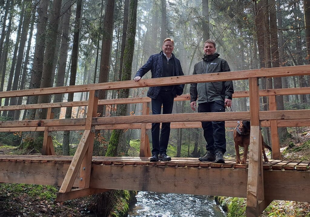 Wie es in einer Pressemitteilung der Bayerischen Staatsforsten heißt, nagt an diesen Brücken jedoch der Zahn der Zeit: „Die Verwitterung und auch die starke Freizeitnutzung setzen den Bauwerken stark zu, so dass ein Austausch unausweichlich wurde, um den Wanderweg am Leben halten zu können.“ Dies konnte im vergangenen Jahr aus Mitteln der sogenannten Fraktionsreserve in die Wege geleitet werden, berichtet Norbert Dünkel, CSU-Landtagsabgeordneter aus Lauf. So konnten im Herbst 2023 die drei am stärksten beschädigten Brücken durch die Bayerischen Staatsforsten ausgetauscht werden.