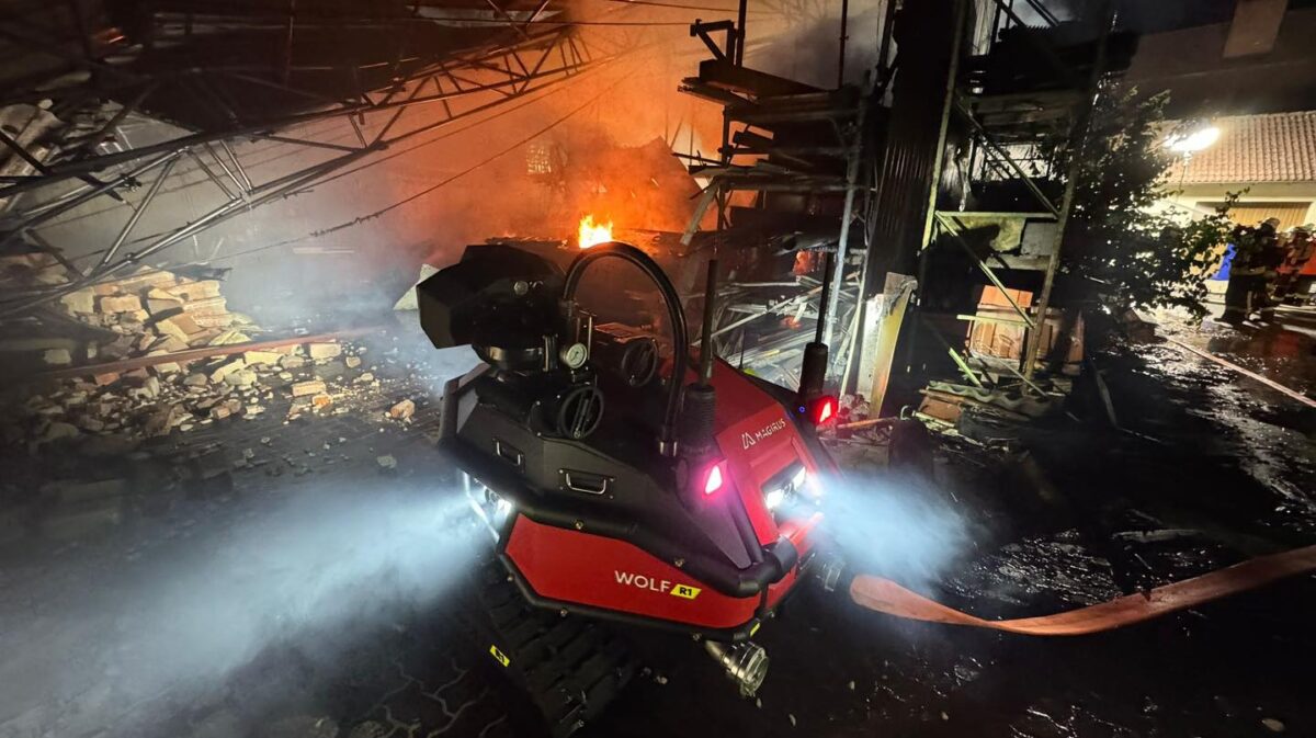 „Wolfi“ half in dieser Situation: Der Löschroboter fuhr direkt in das Gebäude, so dass die Einsatzkräfte die Brandherde unter anderem mit sogenanntem Schwerschaum löschen konnten.