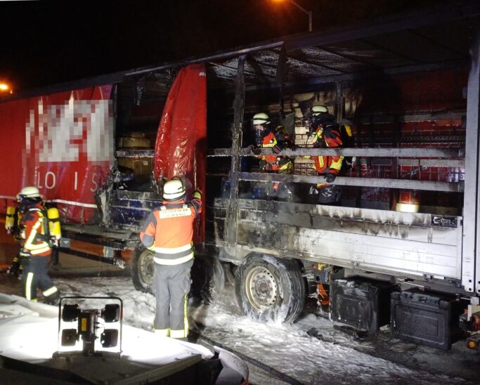 Trotz Löschversuchen mit Hilfe von mitgeführten und von Fahrerkollegen kurzerhand eingesammelten Handlöschern konnte der 55-Jährige nicht verhindern, dass die Flammen auf Teile der Ladung übergriffen. Die hinzugerufene Freiwillige Feuerwehr löschte den Brand aber, bevor er sich zum Vollbrand entwickelte. Dafür eingesetzt waren zwei Trupps unter schwerem Atemschutz.