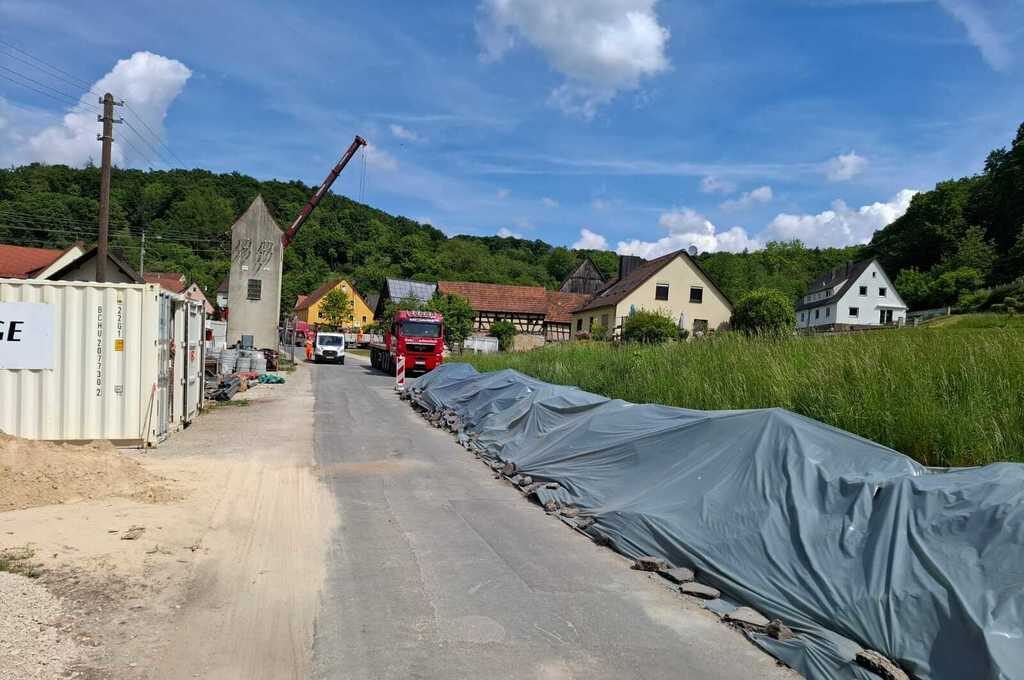 Die Oberndorfer Ortsdurchfahrt ist für den Verkehr gesperrt. Vor Kurzem hat die Baufirma in der Ortsmitte die Betonfertigelemente für den neuen Bachdurchlass mit einem Autokran (im Hintergrund) eingehoben. | Foto: Gemeinde Simmelsdorf2025/05/5635810a89ea798cc59df85662123ae283f6240f_max1024x.jpg