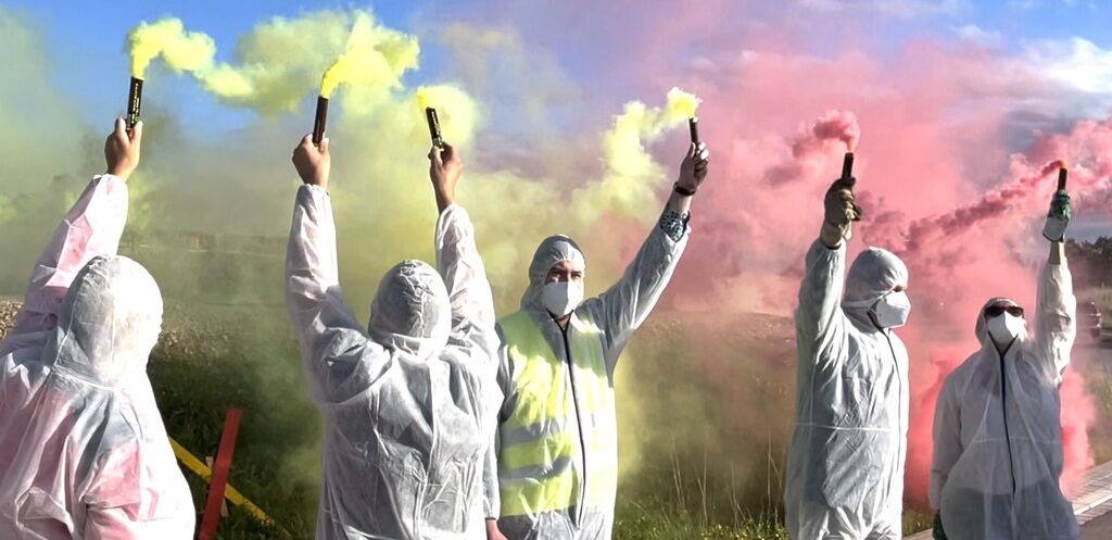 ALTDORF – Mit der Aktion „Rauchzeichen“ haben rund 60 Trassengegner bei Altdorf ein sichtbares Zeichen für den Erhalt des Waldes gesetzt. Nach der Kundgebung an einem Banner, das von den Aktivisten nahe der Autobahn A3 aufgehängt worden war, wurden im nahe gelegenen Gewerbegebiet rote und gelbe Rauchfackeln entzündet.
