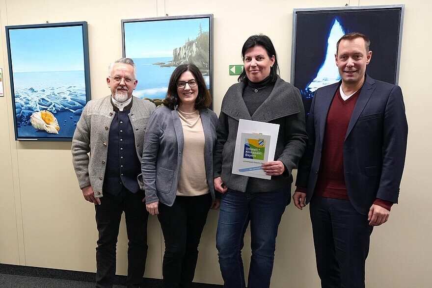 Landrat Armin Kroder (rechts) übergibt die Umweltpakt-Urkunde an Judith Oesterle, Barbara Oesterle und Markus Böhm (von links).2024/12/LRA-Umweltpakt.jpg