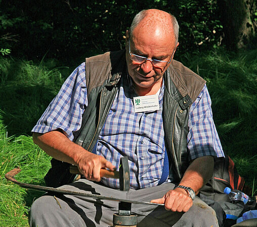 Ludwig Wiedenhofer zeigt das Dengeln einer Sense.