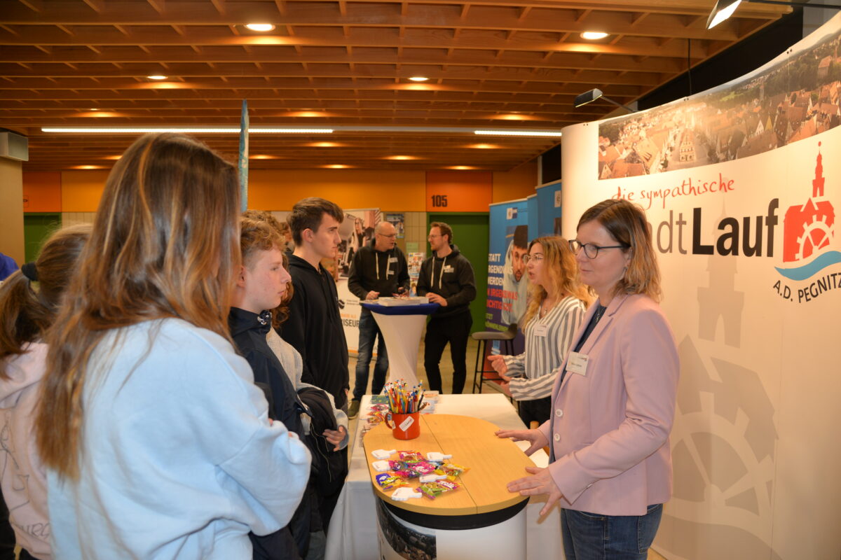 Das Bild zeigt Jugendliche, die sich am Stand der Stadt Lauf über die Stadtverwaltung als Arbeitgeber informieren.