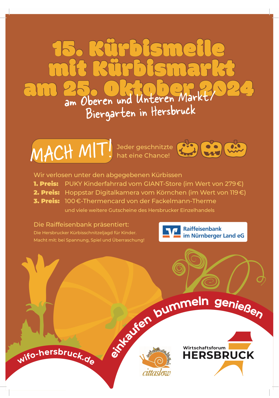 15. Kürbismeile mit Kürbismarkt in Hersbruck    am 25. 10. 2024 ab 15 Uhr Das bewährte Kürbismeilen-Team des Hersbrucker Wirtschaftsforums, bestehend aus Claudia Häffner, Steffi…