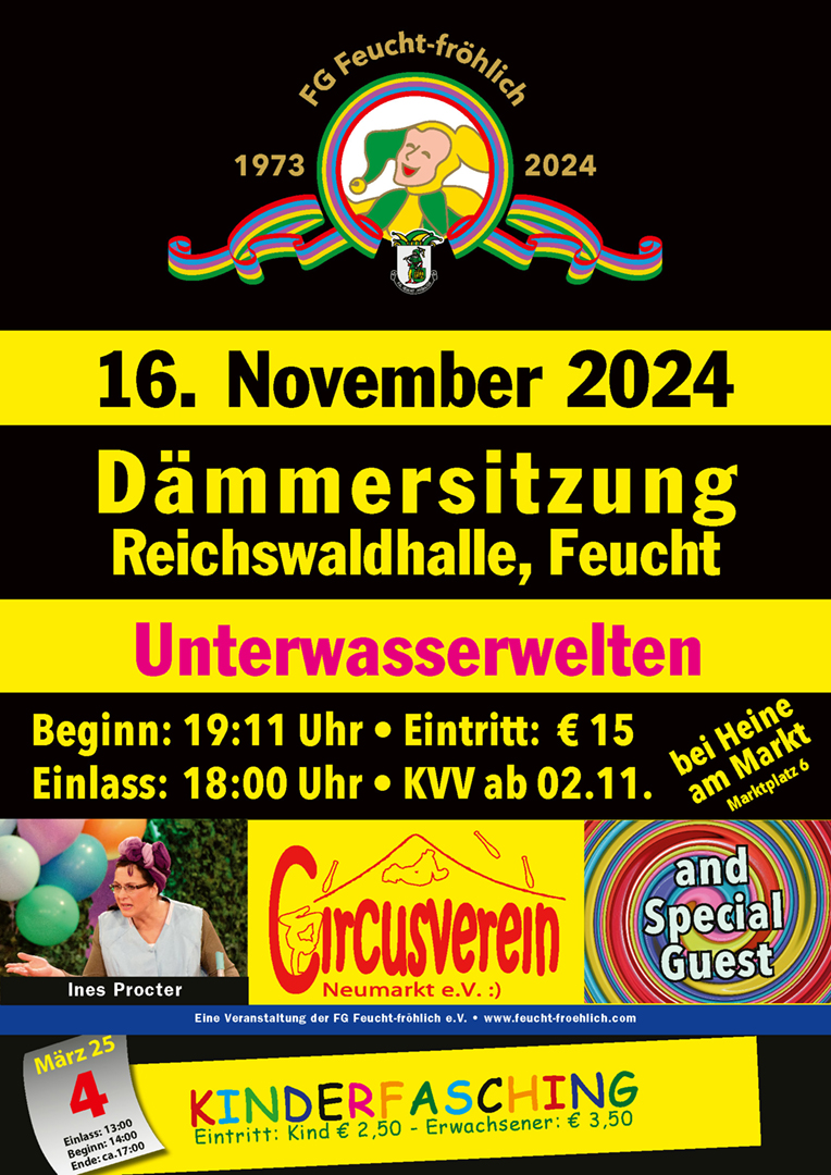 Einlass: 18:00 Uhr – Beginn: 19:11 Uhr Diese Jahr steht die Dämmersitzung unter dem Motto: Unterwasserwelten. Gemeint sind unsere Weltmeere und auch deren Verschmutzung. Unsere Gäste dürfen gerne wieder maskiert mitmachen. Es erwartet Sie ein abendfüllendes Programm mit Bütt, Kabarett, Marschtänzen, Schautänzen und Klamauk, bei dem Ihre Lachmuskeln mit Sicherheit nicht zu kurz kommen werden. Karten erhalten Sie im Vorverkauf bei Schreibwaren Heine am Markt ab 02.11.2024 . Kurzentschlossene können noch Karten an der Abendkasse ergattern. Eintritt: € 15,–