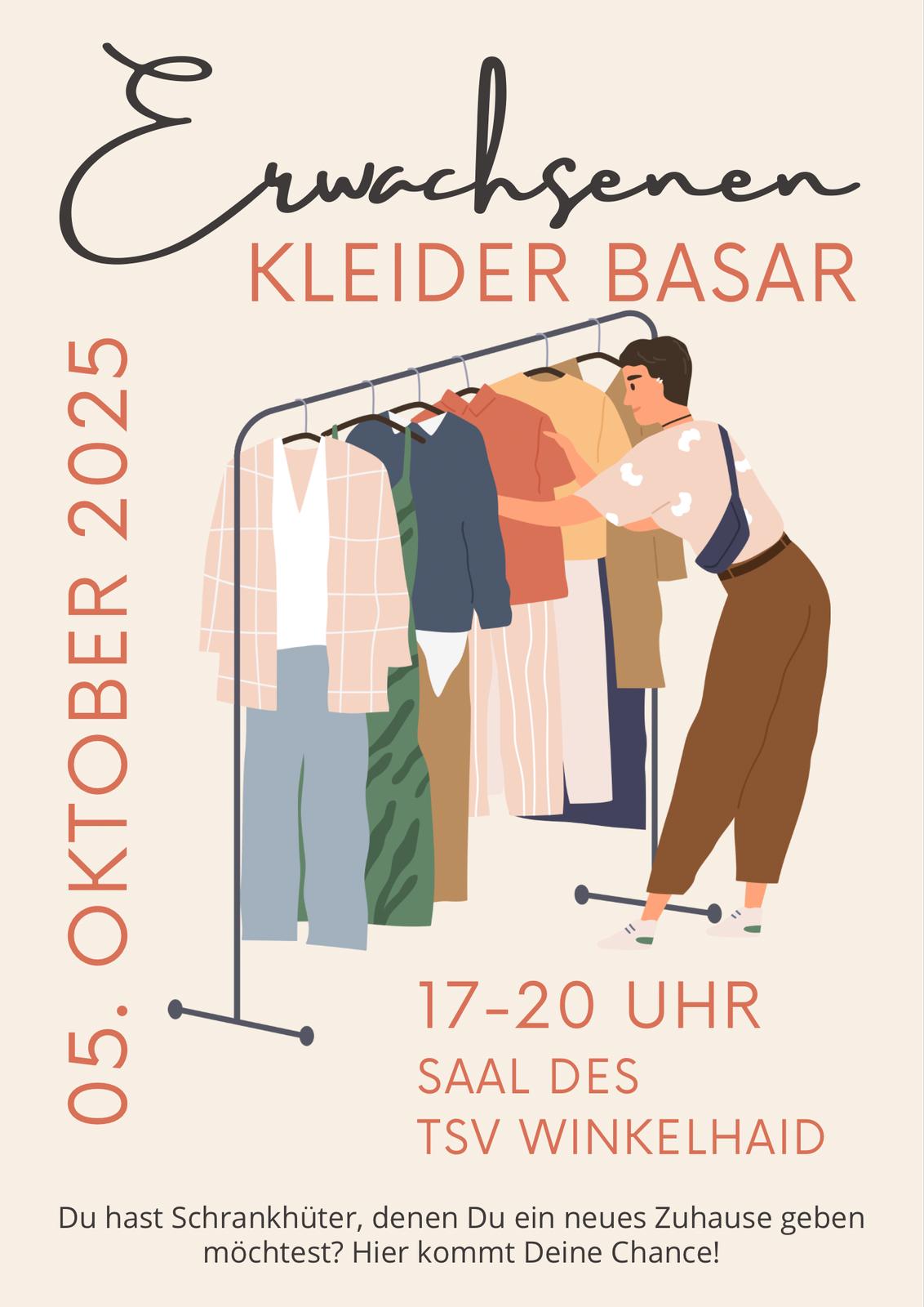 Am ersten Oktoberwochenende erstmalig ein Kommissionsbasar für Erwachsene in Winkelhaid statt. Veranstaltet wird der Basar vom TSV Winkelhaid. Der Verkauf startet am Sonntag, 05.10.2025 von 17 bis 20 Uhr. Ort des Geschehens ist der Saal des TSV Winkelhaid, Sportparkstraße 1.