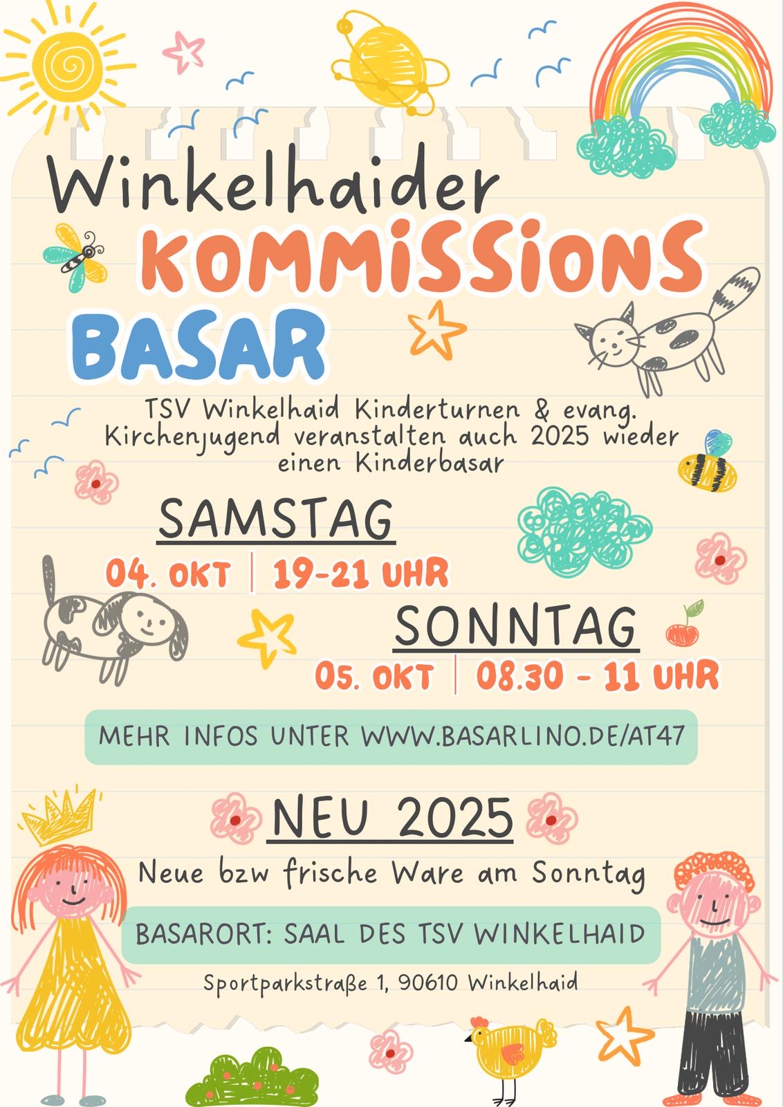 Der TSV Winkelhaid Kinderturnen und die evang. Kirchengemeinde organisieren wieder einen vorsortierten Kinderbasar im Sportheimsaal (Sportparkstr. 1, 90610 Winkelhaid).