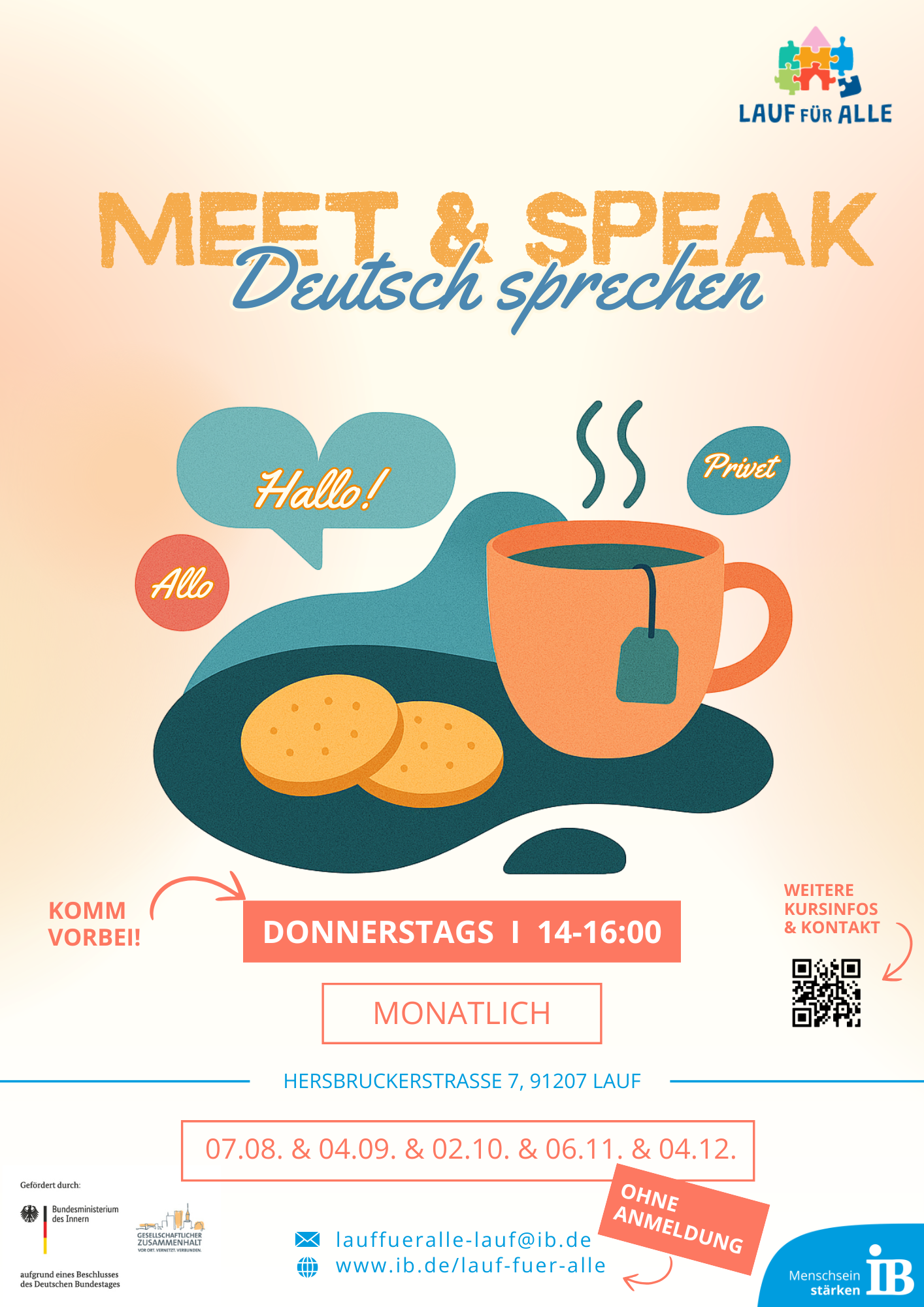 Projektraum „Lauf für Alle“ Hersbrucker Str. 7, Lauf, DeutschlandMeet & Speak – „Deutsch reden & üben“ Donnerstag 07.08. I 04.09. I 02.10. I 06.11. I 04.12. von 14:00-16:00 (monatlich) Wir laden dich ein:…