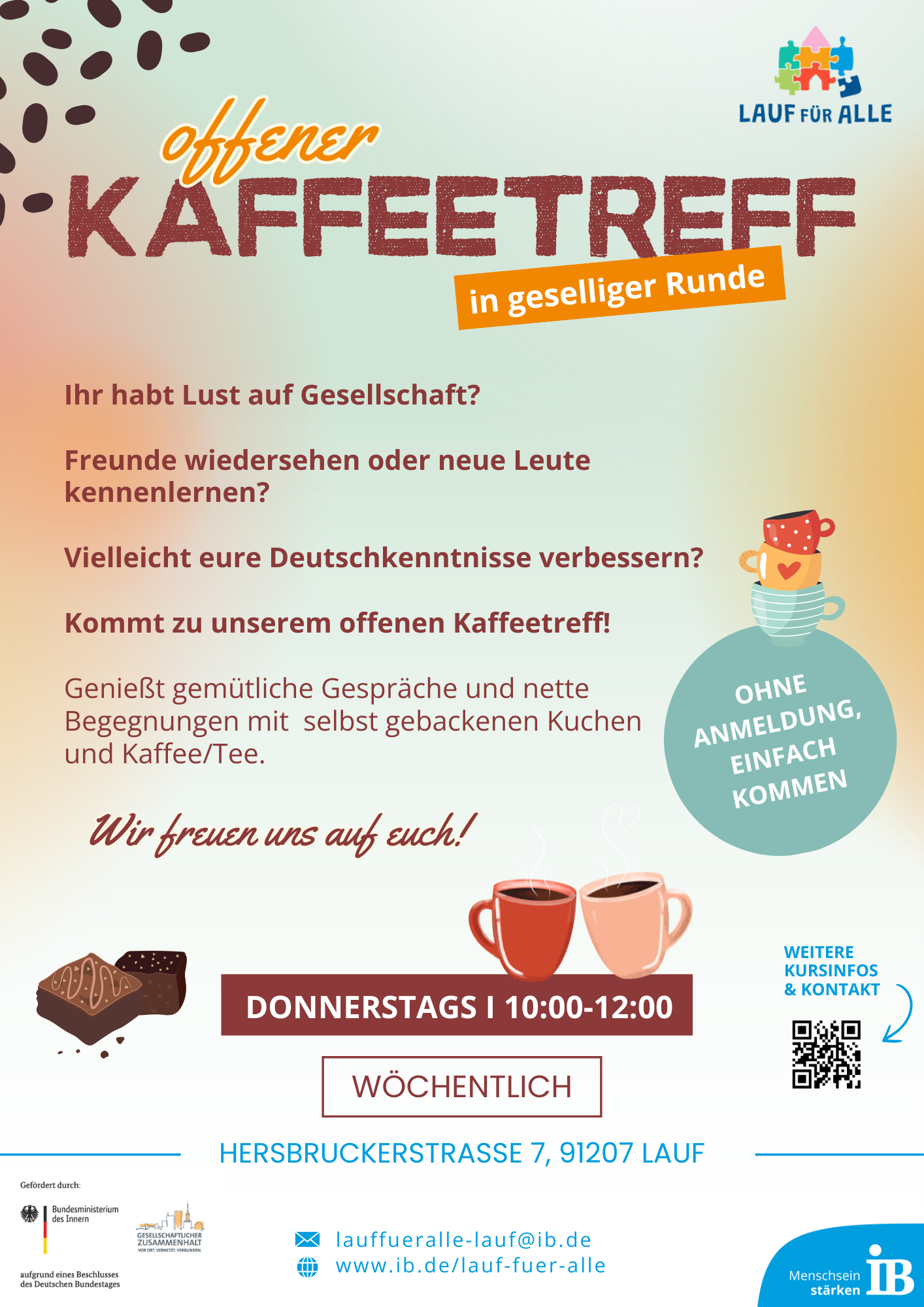 Projektraum „Lauf für Alle“ Hersbrucker Str. 7, Lauf, DeutschlandOFFENER KAFFEETREFF am Donnerstag in geselliger Runde Ihr habt Lust auf Gesellschaft? Freunde wiedersehen oder neue Leute kennenlernen? Vielleicht eure Deutschkenntnisse verbessern? Kommt zu unserem…